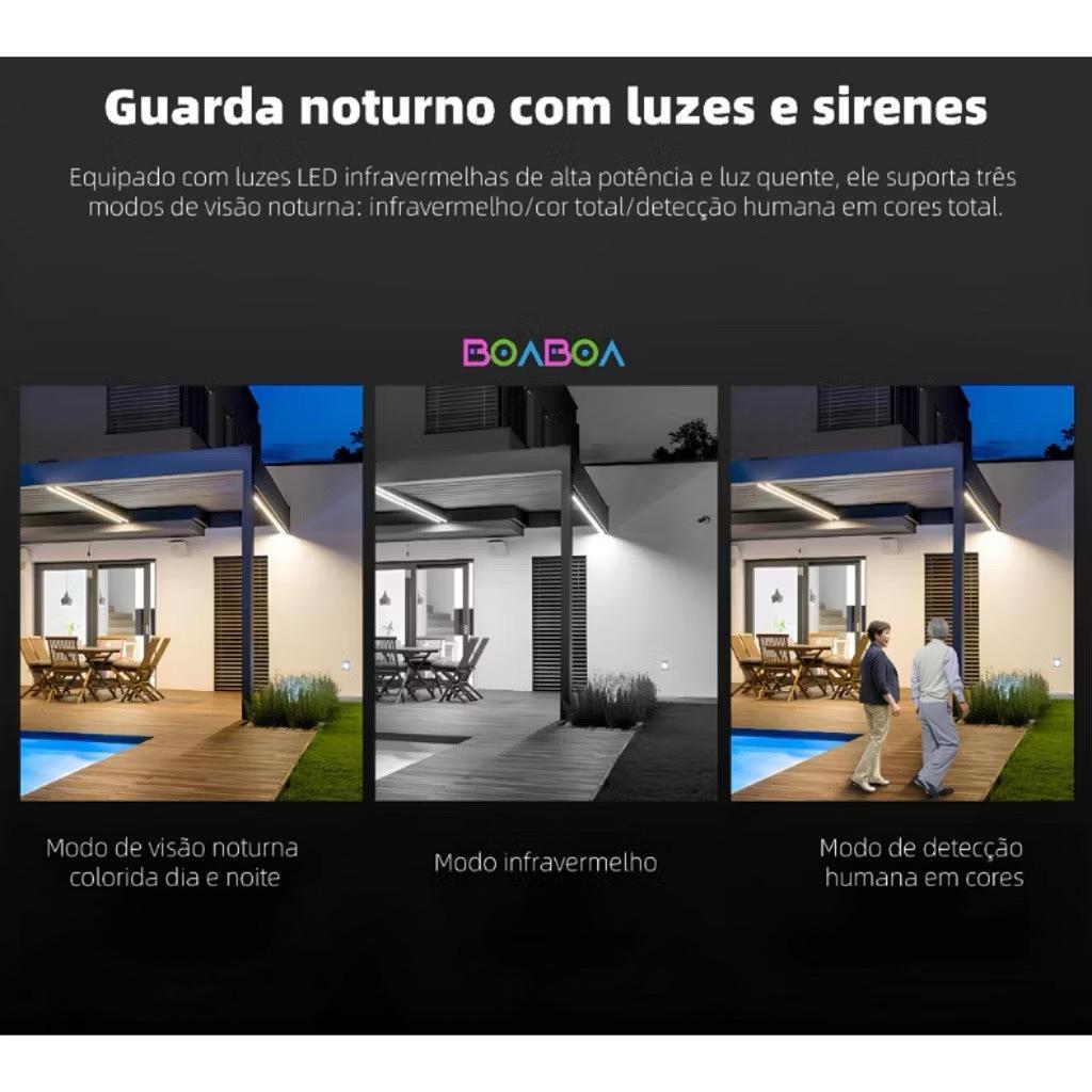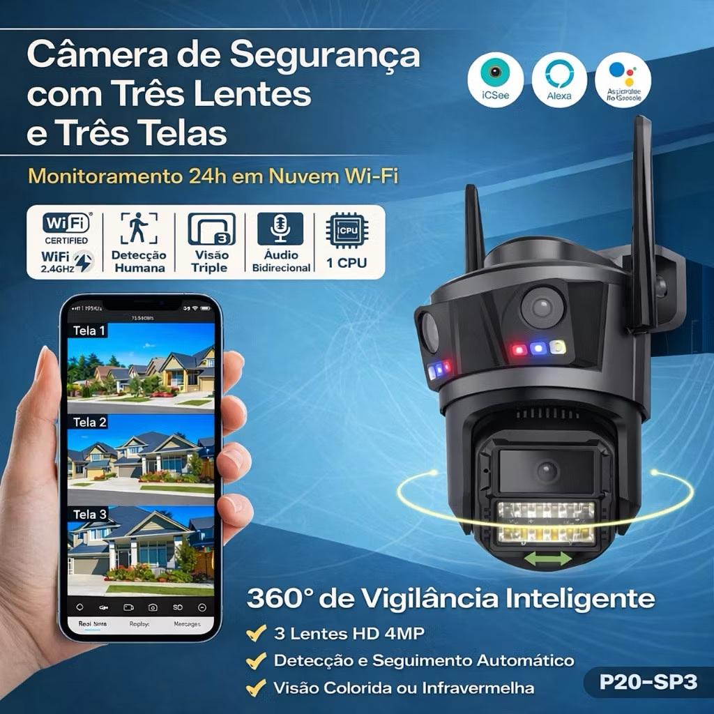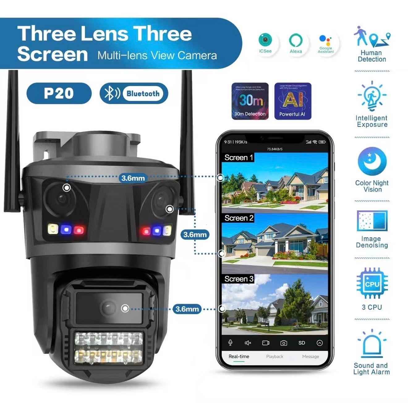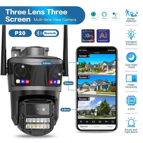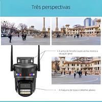 Câmera Segurança Externa 4K Wi-Fi 3 Lentes 360°, Zoom Ótico IA Detecta Pessoa Animal Visão Noturna,Bluetooth