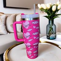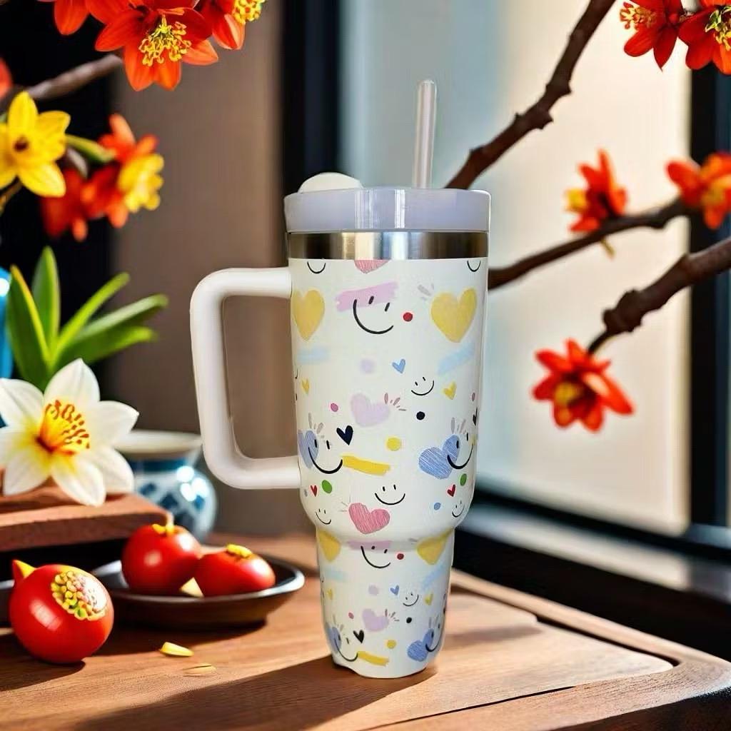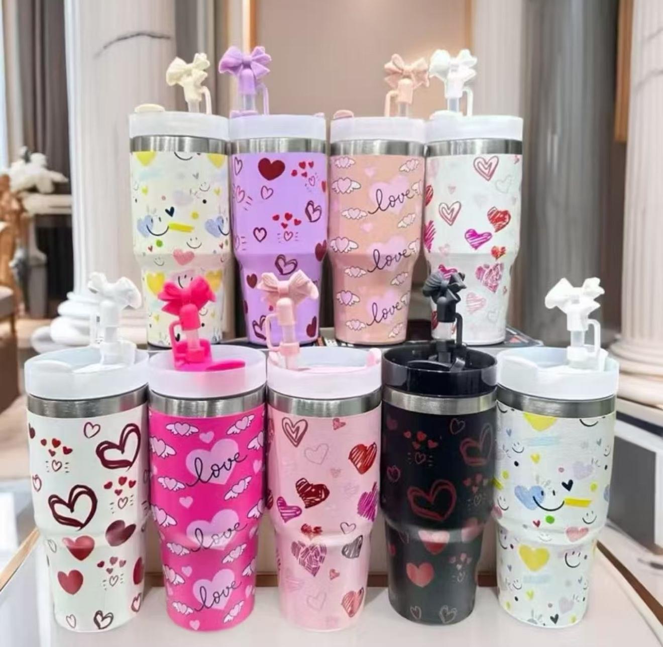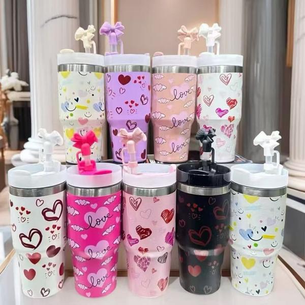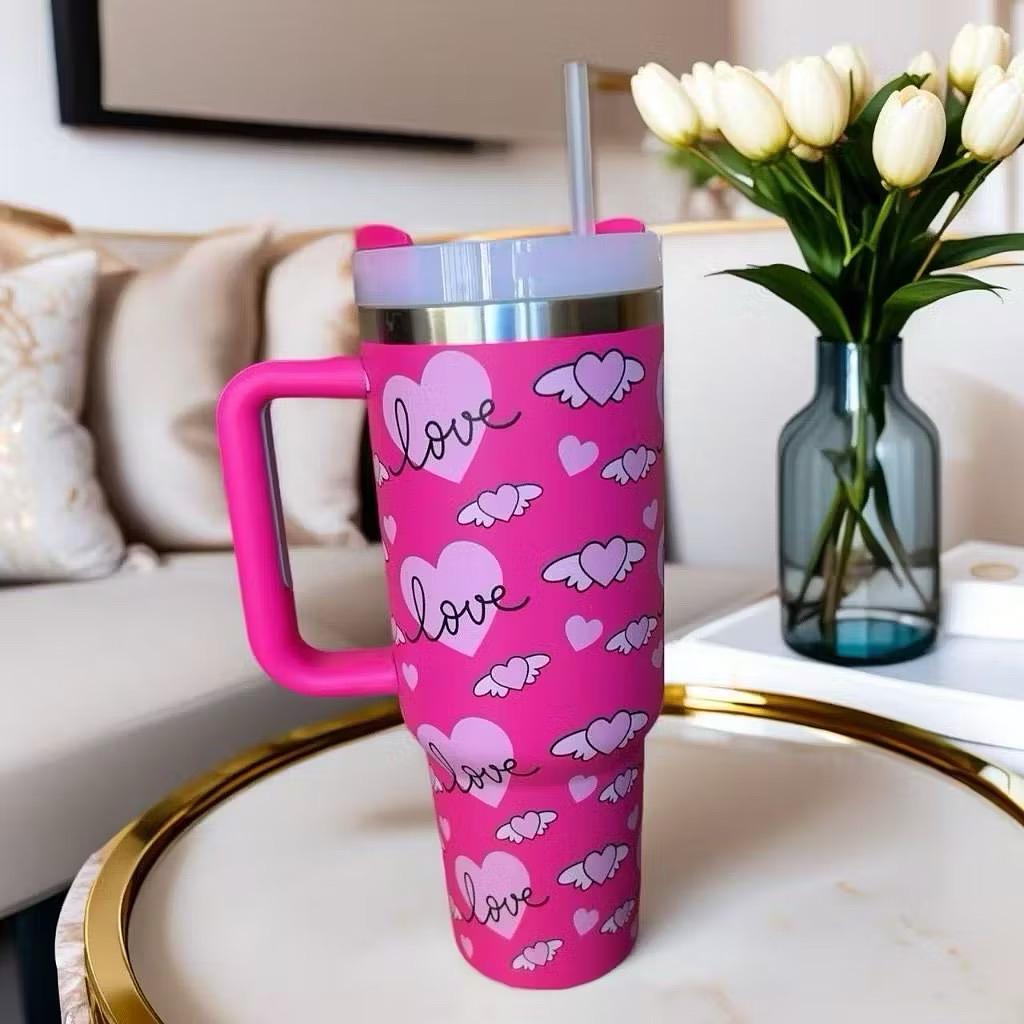 Copo Térmico 1200ml com Alça e Canudo – Estampa de Corações
