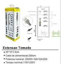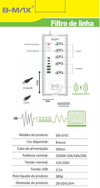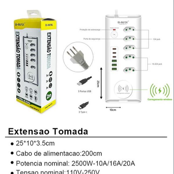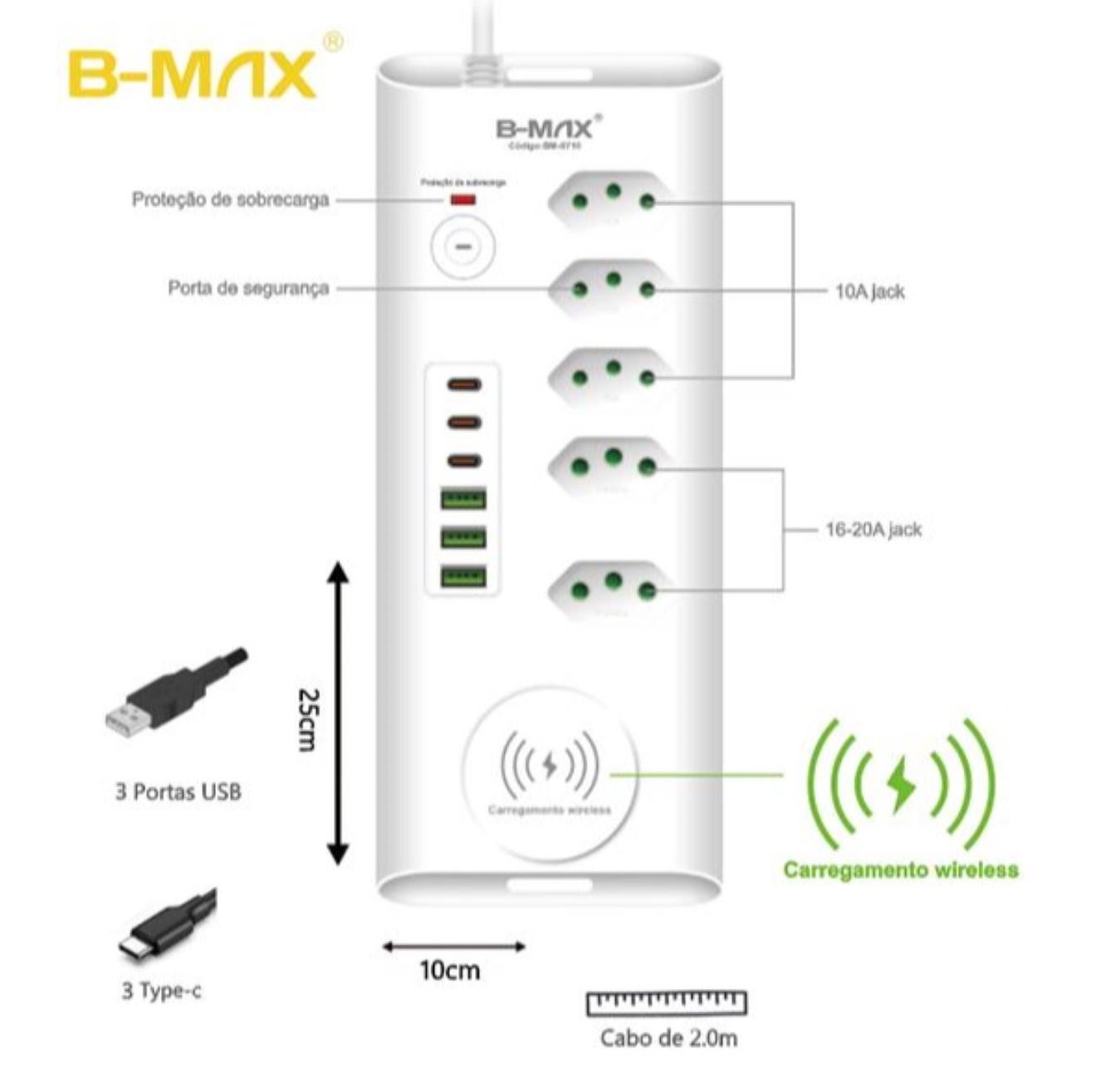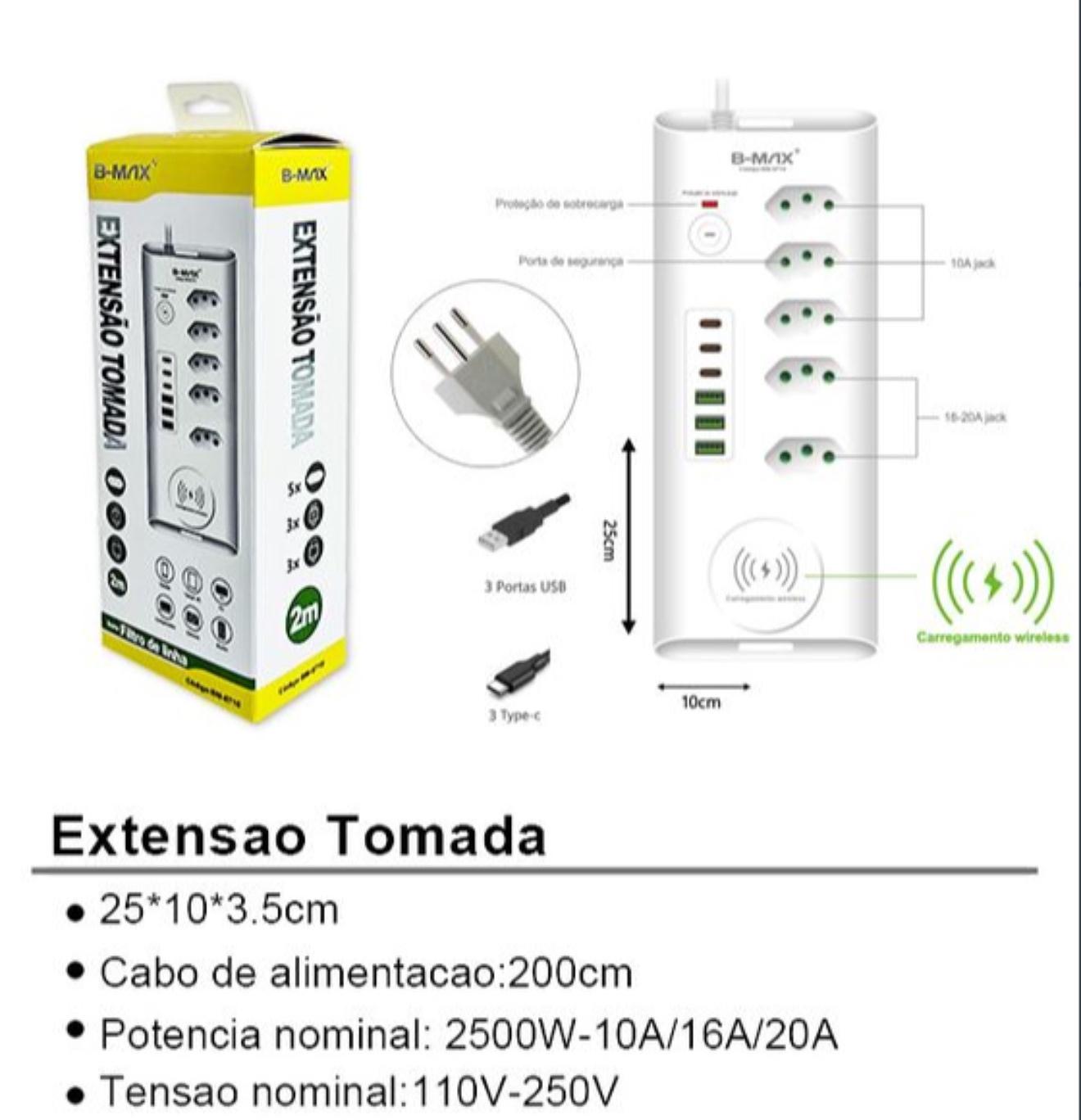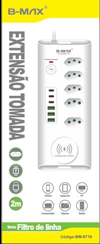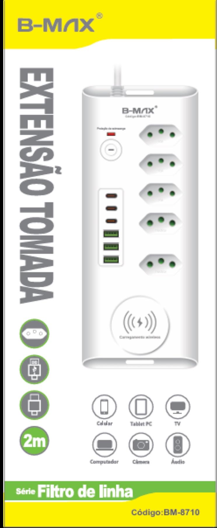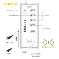 Filtro de linha Regua de Tomadass 5tomadas 3USB 3Tipo C E INDUÇÃO UNIVERSAL—BMAX